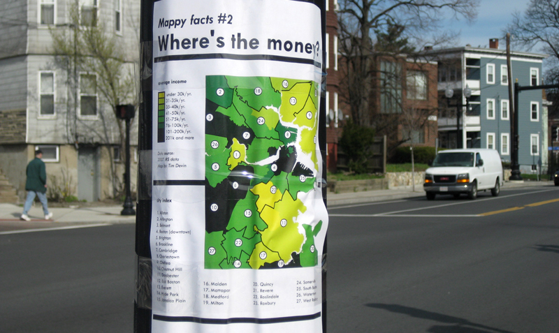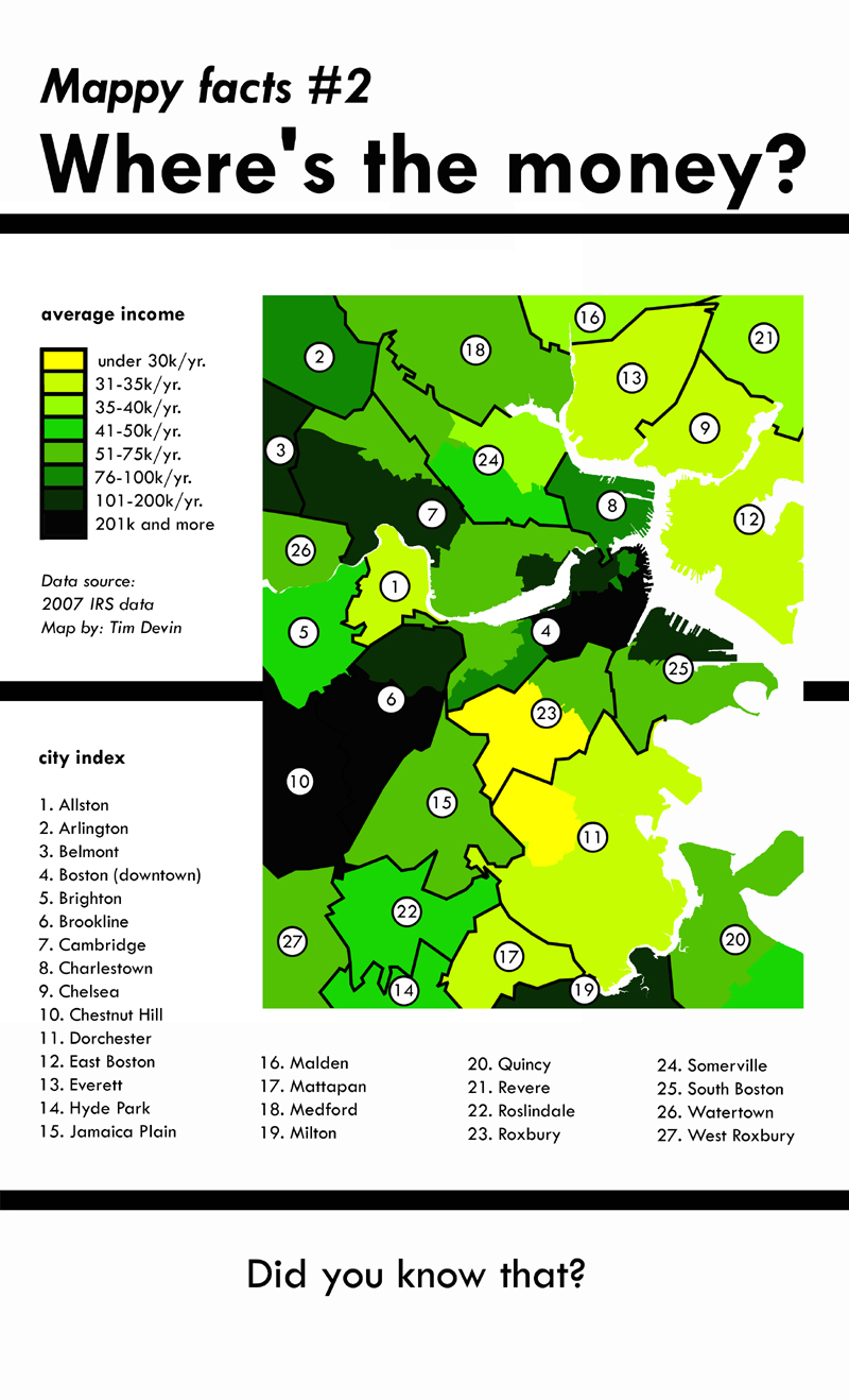 In early 2011, I started printing up my Mappy Facts posters. They were full-color infographics, showing statistics on crime and income inequality in the Boston area. They looked like patchwork quilts-some areas with very high wealth were surrounded by low income areas, and vice versa. How was this possible?
