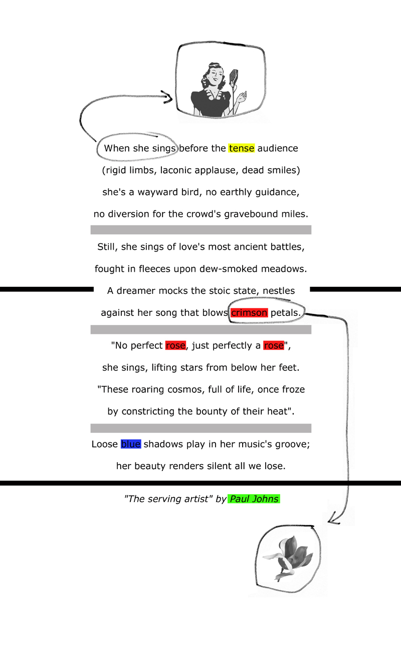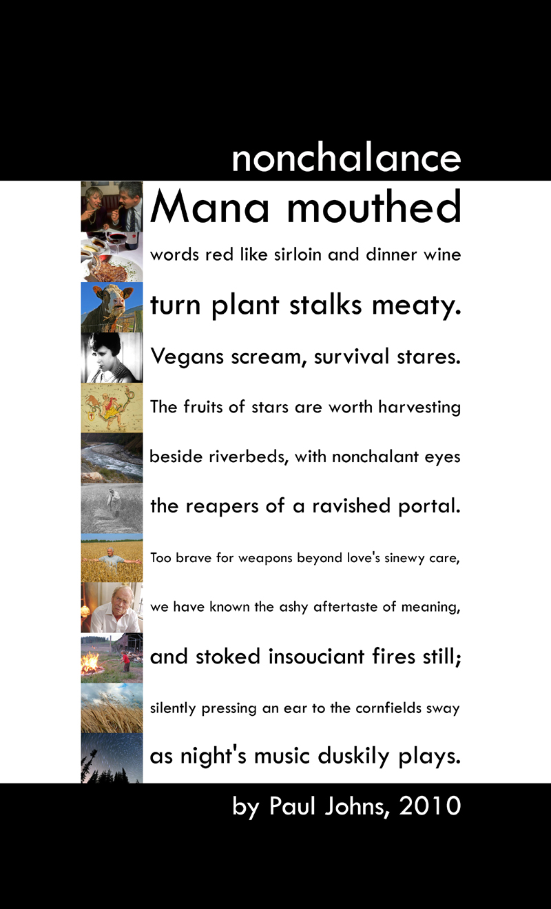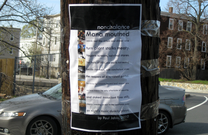 In early 2011, I thought it might be nice to spread some poetry around as an alternative. I asked local poet Paul Johns if I could use some of his shorter poems, and he gave me two to play around with. I designed one sign to look like a listing of music events, another to look like it had been drawn on.