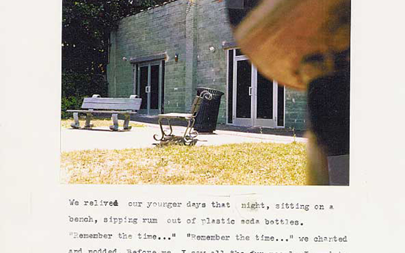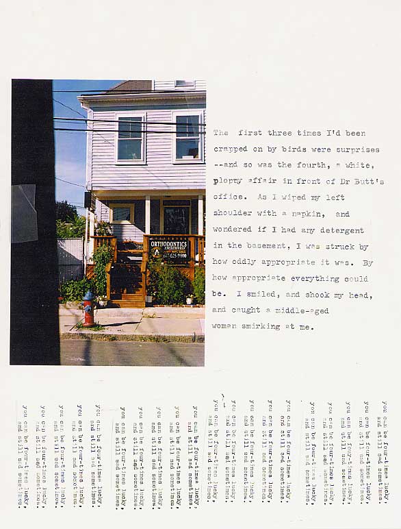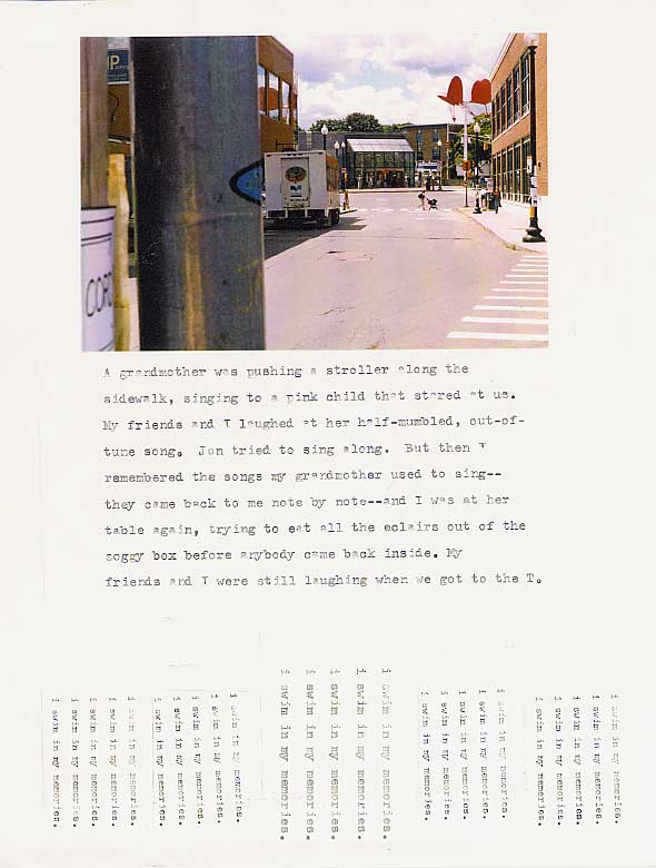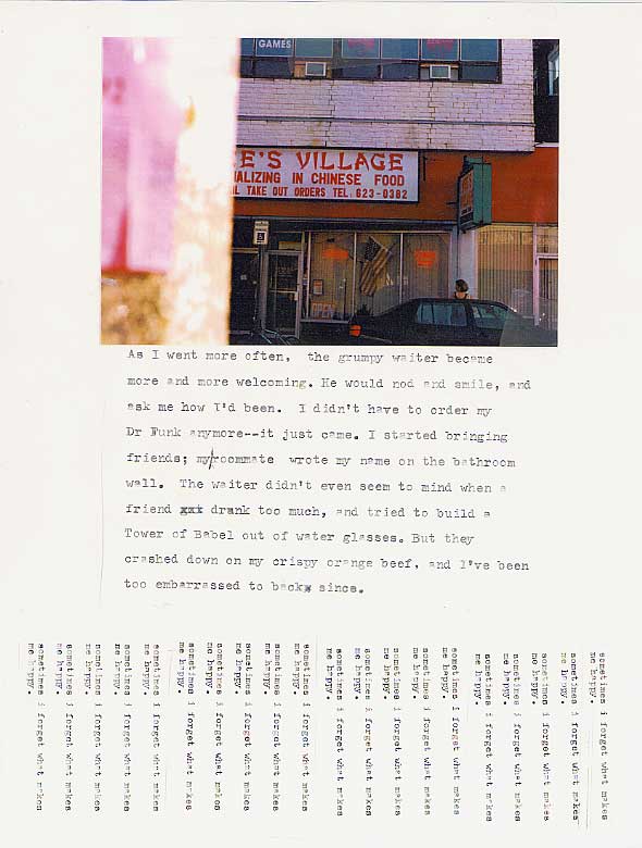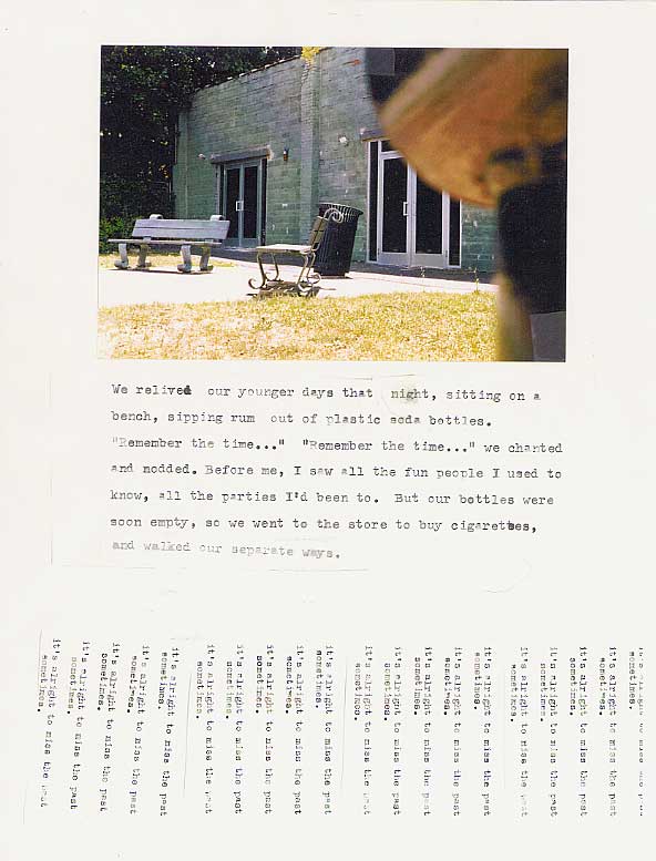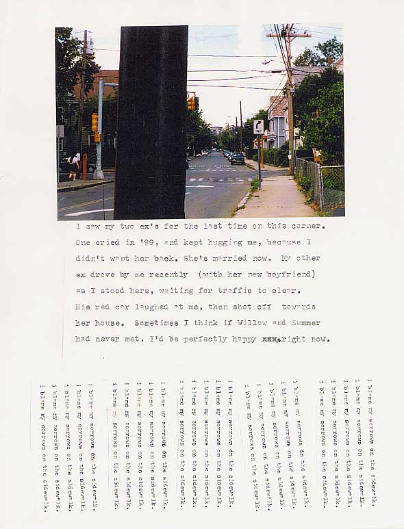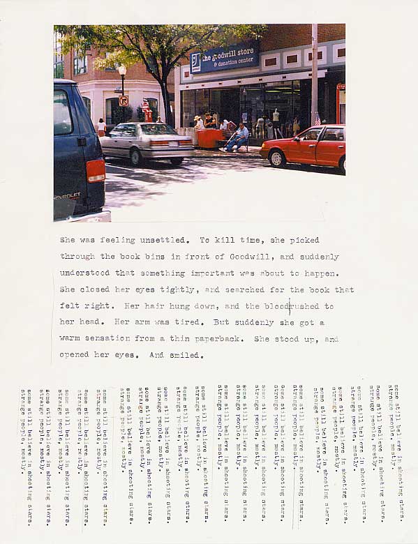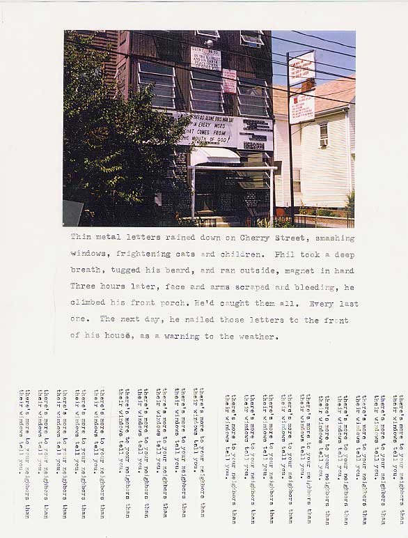 Each photograph was of the exact spot in front of the viewer; and each paragraph explained a meaningful experience or a daydream I'd had in that spot. I left them vague and anonymous, so anyone could identify with them. At the bottom was a phrase loosely related to the paragraph I'd written; when you ripped one off, it looked like a fortune-cookie fortune.