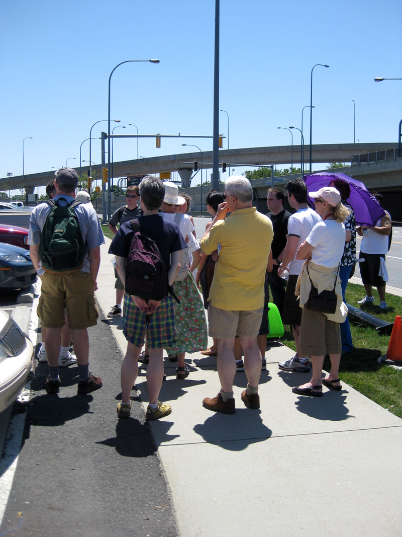 On Saturday, June 19, 2010, about twenty people joined me for a group exploration of this sidewalk, as part of the Common Boston festival. There were a few architects and urban planners along, as well as a man named Mike who'd grown up near the airport in East Boston; a pilot named Patrick who'd written a book about Logan's history; some people involved in making public space more walker-friendly; and a number of other interested local residents. MassPort's spokesperson, Kay, was nice enough to join us as well.