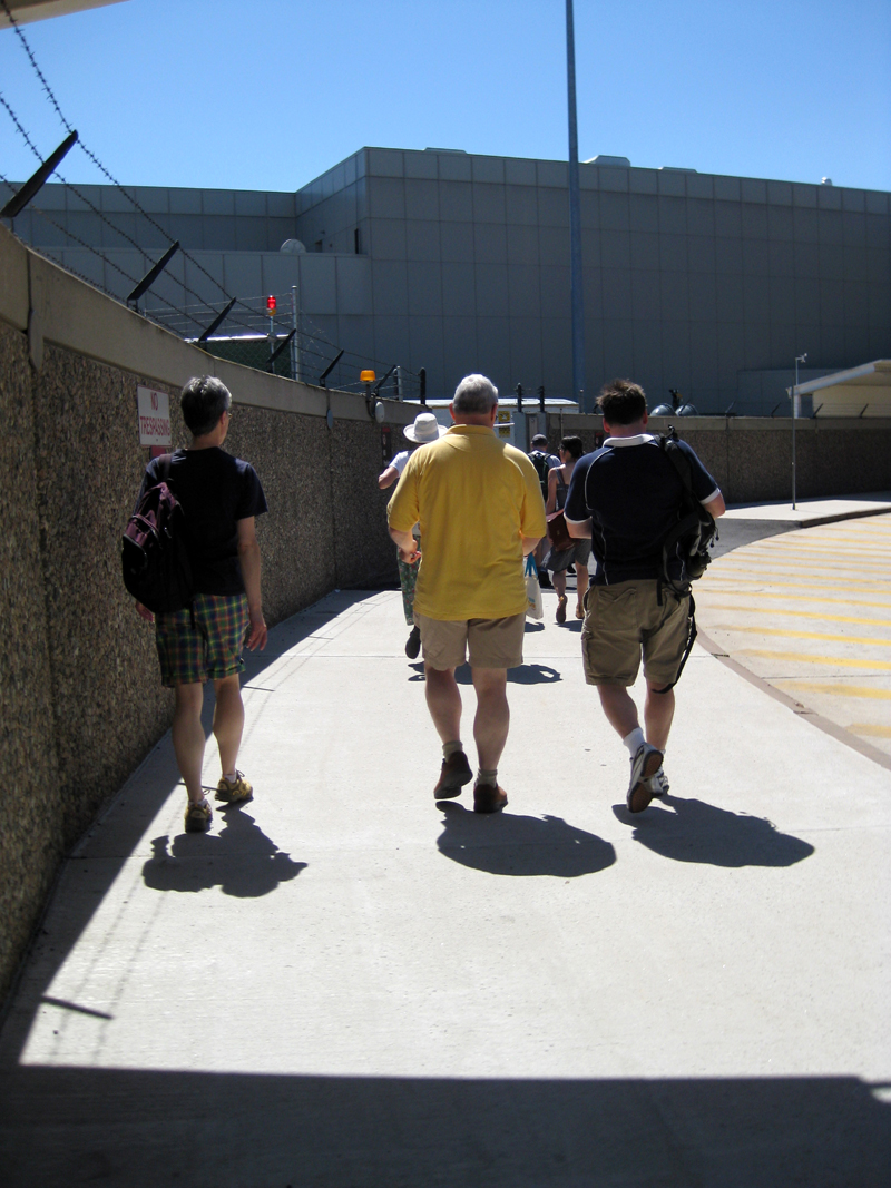 As we walked, Kay and I told everyone about Logan's architectural history. Patrick added information about a number of buildings, such as the fact that Terminal E had been extended out, which explained the strange cul-de-sac at the building's southern end. As a group, we examined and discussed the fenced-off areas for dogs (known as "PetPorts"); the airport's special trash barrels (known as "bomb barrels"); and the strange open areas in front of the terminals. We also stopped and looked at each terminal building; the consensus was that not many of the buildings seemed designed to be looked at from the street.