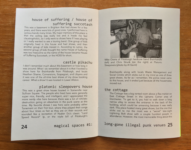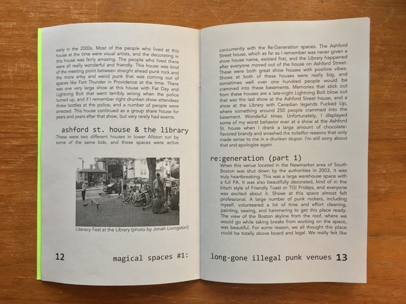 This zine is part of Free the Future Press's "Magical Spaces" series, which takes a look at Boston's DIY and underground cultural spaces-everything from punk basements to artist lofts.
